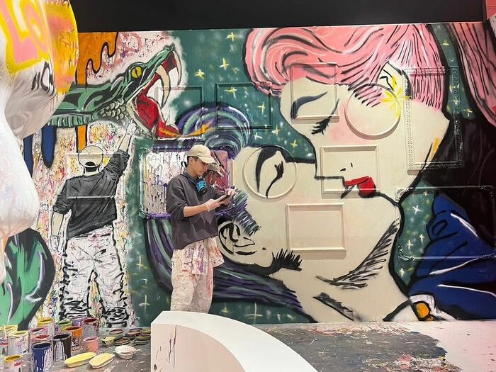 右側の壁には、キラキラ星に囲まれて、男性と女性が目を閉じてキスをする、なんともロマンチックなアートが大きく描かれています!近くには、まさに今 大きな蛇を描いている最中と思われる岩田さんの後ろ姿の自画像も!?