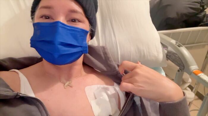 病室のベッドの上でアンナさんは、胸元に埋め込んでいるポートという医療器具について触れました。