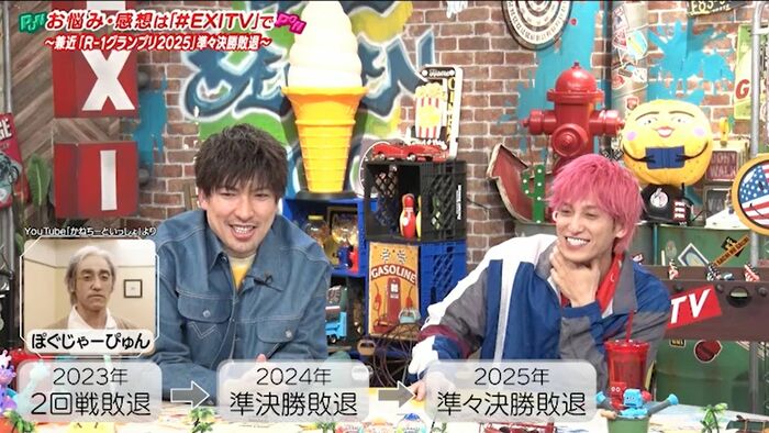EXITがゲストとリラックスしたトークを繰り広げる『EXITV』(フジテレビ)。3月4日の放送回のオープニングトークでは、兼近さんの『R-1』敗退についての振り返りトークが展開されました。