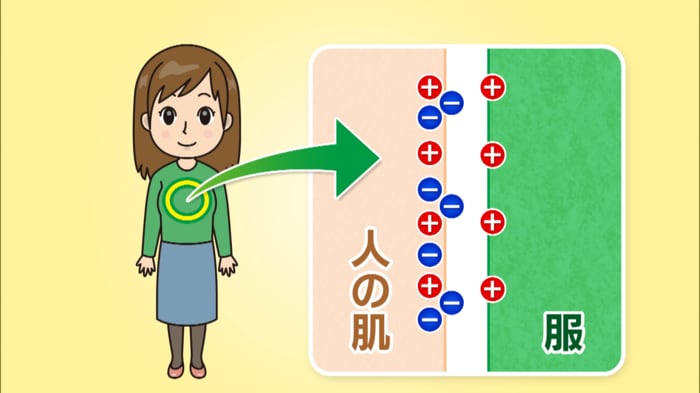 人や物は通常、プラスとマイナスの電気を"同じ数"持っています。しかし、例えば人の肌と衣服がこすれるなどすると電気が移動し、プラスとマイナスのバランスが崩れてしまいます。この状態を「帯電している」といいます。