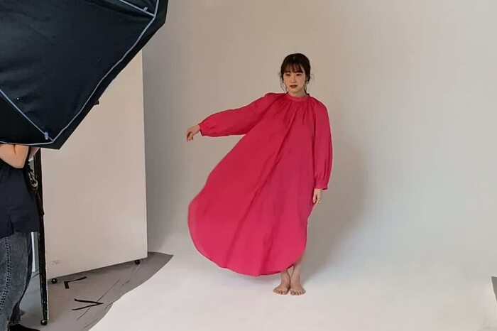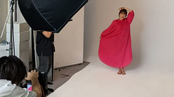 ワンピースがふわりとなびくようなカットを撮影するため、スタッフは試行錯誤。最終的に、裾を持った三上アナが、カメラマンの「せーの」というかけ声に合わせて手を離し、その瞬間を撮影することに。しかし、何度やっても納得いくカットが撮れず…「息が合わない(笑)」と、笑ってしまう三上アナ。