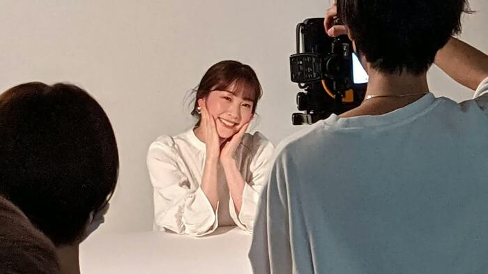 続いて白い衣装に着替え、表紙の撮影へ。自然な表情を求められた三上アナは、「笑うと目がなくなっちゃうんだよね(笑)」と言いながらニッと笑ったり、頬杖をついたり、キリッとした表情を見せたりしていた。