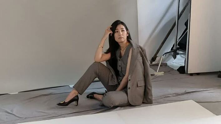 慣れないファッション誌スタッフとの撮影に、はじめは緊張している様子の新美アナだったが、徐々に慣れてくるとスタッフとコミュニケーションを積極的にとり、さまざまなポージングを披露していく。