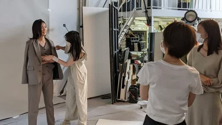 マニッシュなセットアップと、ヌーディでつや感のあるメイクで姿を見せた新美アナに、スタジオ中から「かっこいい!」という声が飛ぶ。さらに、撮影が始まり、新美アナがカメラに向かってニコッと笑顔を見せると、今度は「かわいい!」の声に変わる。見守るスタッフのリアクションに、新美アナは思わず照れ笑い。