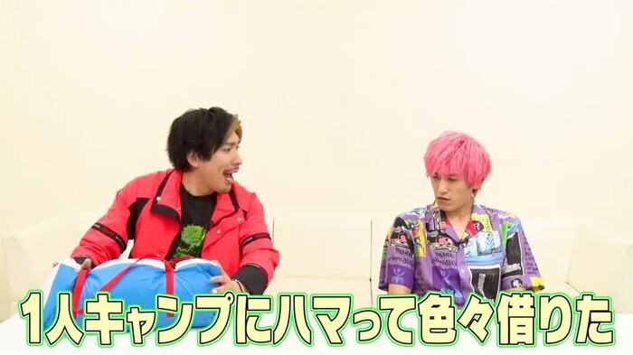 兼近が楽屋でくつろいでいると、りんたろー。 がキャンプに出掛けるかのような姿で楽屋入り。最近「ひとりキャンプ」にハマっているというりんたろー。 は、アリススタイルで、さまざまなキャンプアイテムをレンタルしていた。