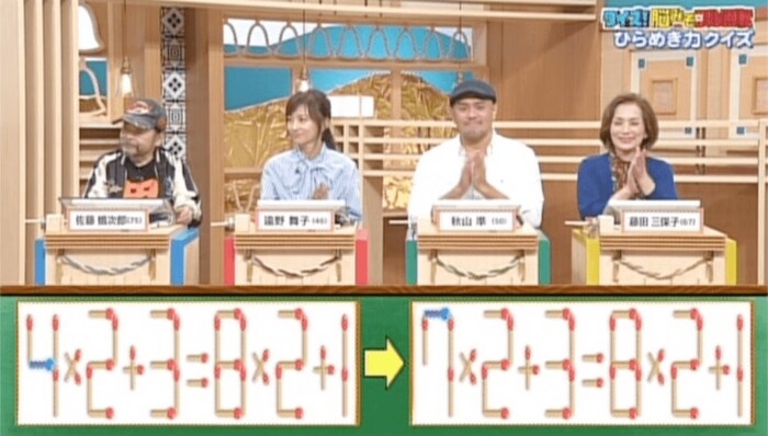 正解は、左の式の「4」の横向きのマッチ棒を上にずらして「7」に。すると「7×2+3=8×2+1」となり、正しい式になりました。