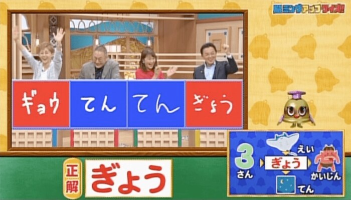 芦屋雁三郎さんと高見恭子さんは「てん」と回答して不正解。森恵さんと仲町浩二さんが正解でした。