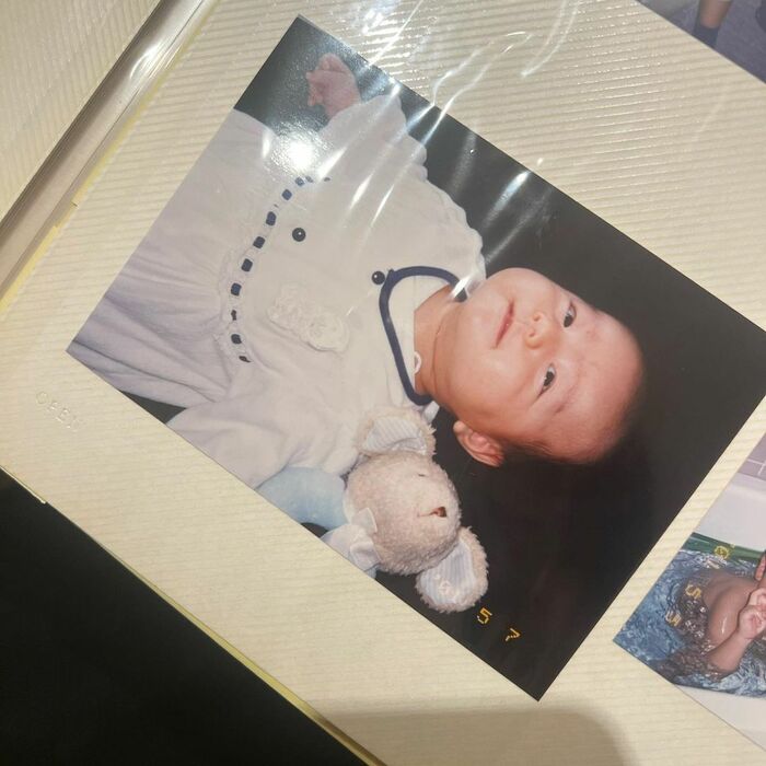 実家に戻ったときに見つけたという生まれたときの足跡や、幼少期の家族写真などを公開しました。