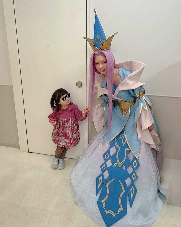 コメントでは自身が出演する舞台の初日を無事に終えたことに触れ、「昨日、寝起きの娘が私の女王姿をみたがって登園拒否したので…笑 ばあばと共にゲネに連れていき、ステージにいるところをはじめてみせることができました」ということで、紫ロングヘアのドレスを着た“変身後”の女王様衣装でこもちゃんとの2ショット写真も披露しました。