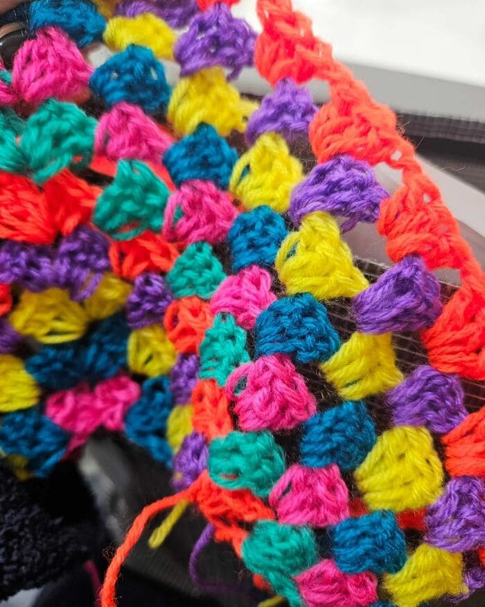 カギ編みという手法で編まれたストールは、オレンジやピンク、パープル、イエローなどとてもカラフルで華やかです!