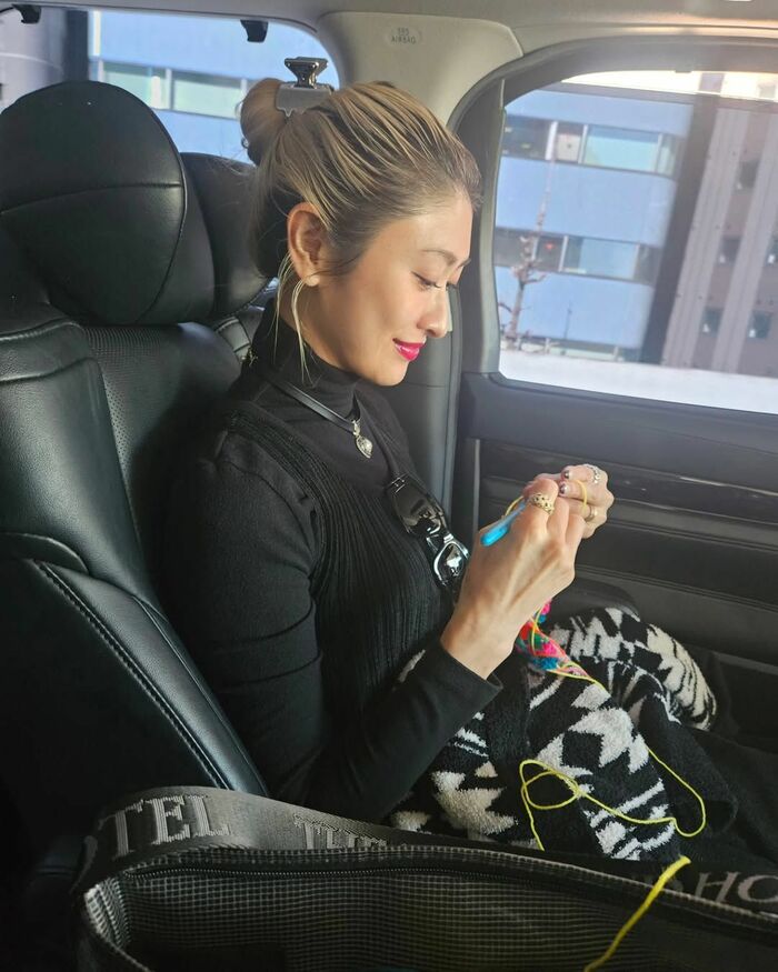どうやら、編み物にハマっている様子の山田さん。「車での待ち時間も逆にラッキータイム♡♡♡」と、車の中で楽しそうに編み物をしている自身のショットも投稿。隙間時間を上手に活用しているようですね!