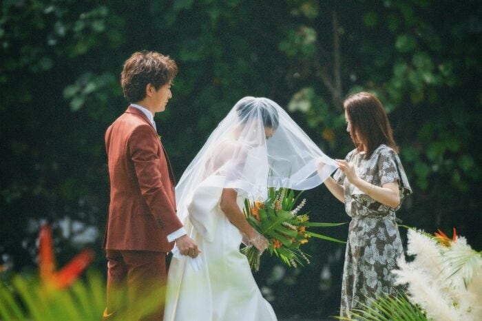 純白のドレスに身を包んだみちょぱさんのベールをめくろうとする母親とそれを見守る大倉さんの姿を切りとった1枚の写真です。
