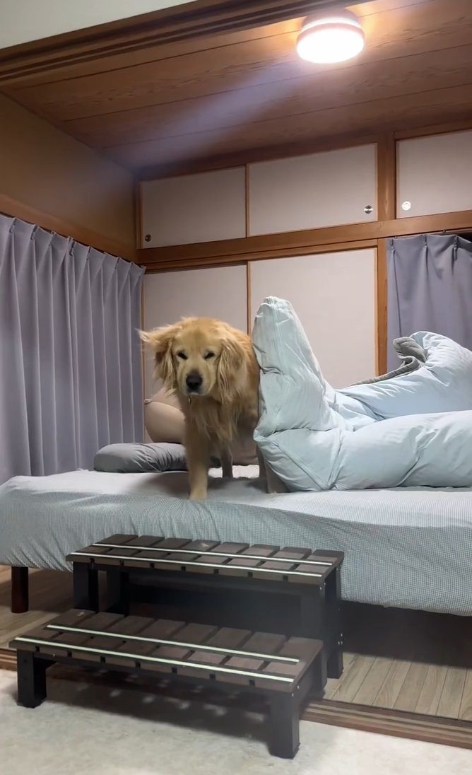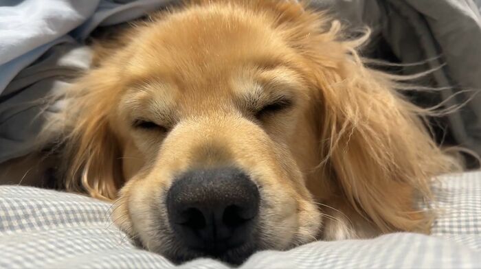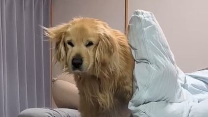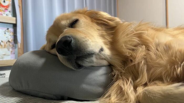 今回話題となったのは、「寝起き感満載のゴールデンレトリバーが起きてきた!」というコメントと共に投稿された1本の動画。