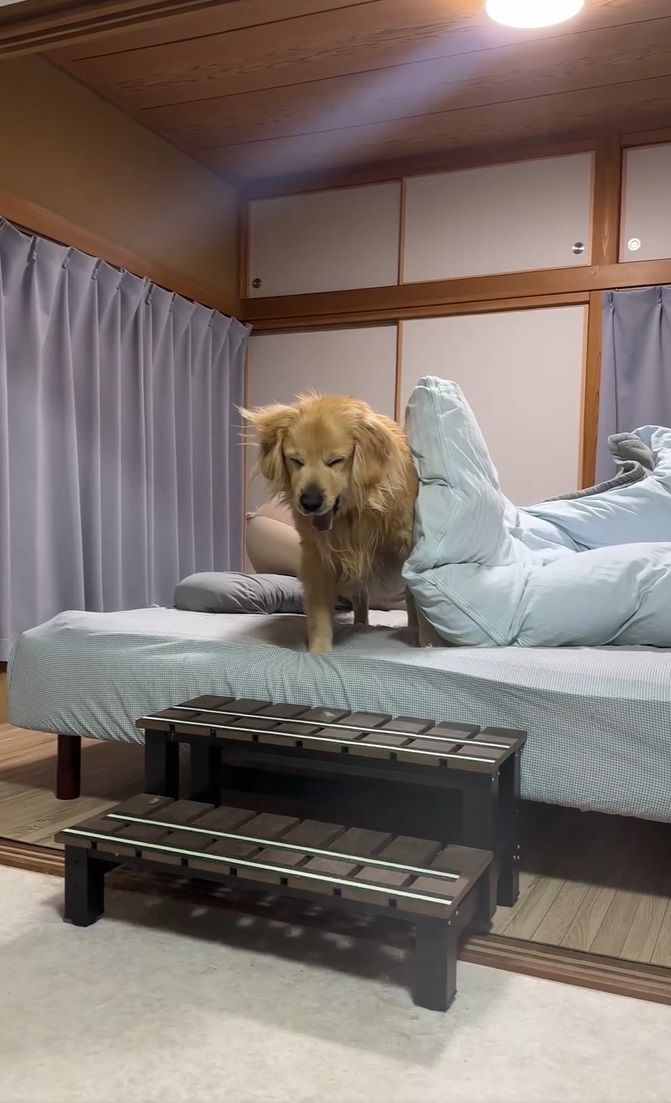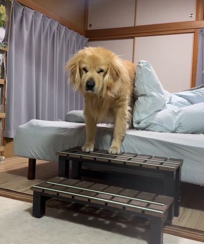 ベッドの脇にある階段に一歩踏み出しますが、トロンとした目で「まだ眠いんですけど」と聞こえてきそうな表情をする「びすけ」くん。