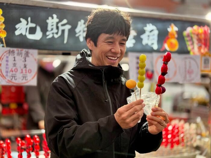 そこには、夜市の屋台の前でいちごやマスカットなどのフルーツあめを手にしている西島さんの姿が。