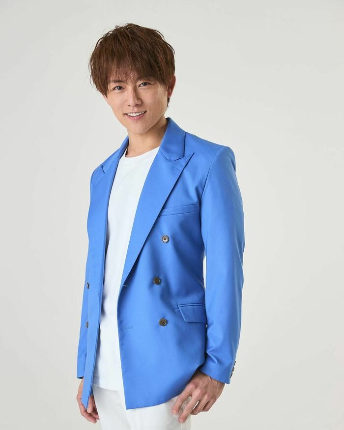 ブルーのジャケットを羽織り、爽やかな笑顔を見せている杉浦さん。