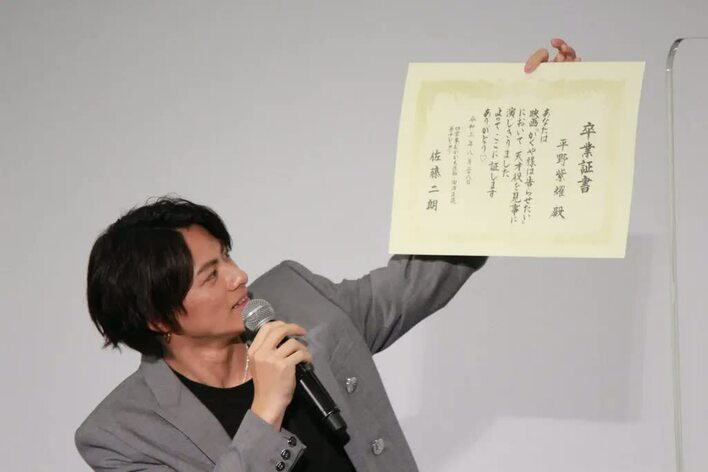 本作が「ファイナル」ということにかけて、佐藤から「平野と橋本の2人に、私の方から卒業証書を授与したい」と提案が。「佐藤二朗と堀田真由とのラブシーンの引き立て役として、本当にこの映画を盛り上げてくれた。主役を演じきった私から礼を言う。よってここに卒業証書を授与したいと思います」と冗談交じりで話し、2人は爆笑しながら「ありがとうございます」と感謝。
