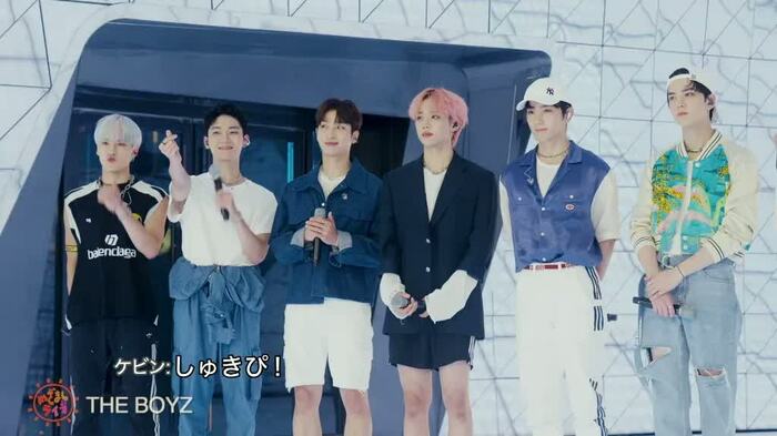 1曲目「Breaking Dawn」の披露後、THE BOYZは1人ずつ「最近覚えた日本語」とともに自己紹介することに。「THE B(※)しか勝たん~」(ニュー/NEW)、「しゅきぴ♡」(ケビン/KEVIN)とかわいらしくカメラ目線を決めるメンバーの中で、ハンニョン(JUHAKNYEON)は「おはようでやんす!」と変化球の日本語を披露し笑いを誘う。