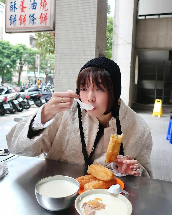 別の写真では、台湾の揚げパンを左手に持ちながら、右手に持ったレンゲでスープを飲んでいる様子や…