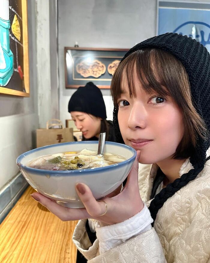 両手で台湾スイーツの「豆花(トウファ)」を顔の近くで持ち、じっとカメラを見つめる至近距離ショットも。