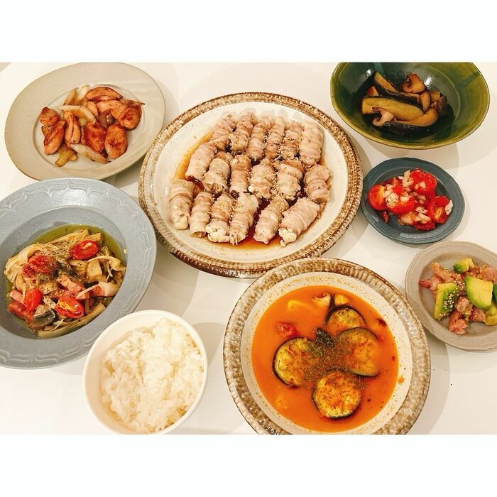 「完全に作りすぎてしまいました。1人だよこれ。とほほ。」と明かしたショットでは、食卓にずらりと彩り豊かな料理が並んでいます。