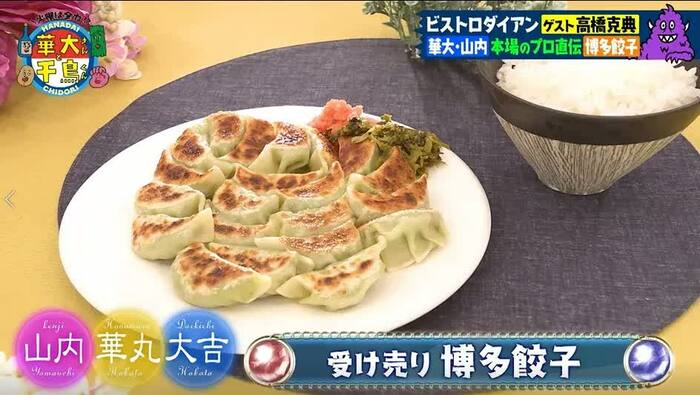 華大&山内チームが作ったのは、華丸が馴染みのお店から作り方を教わったその名も「受け売り博多餃子」。ラードによってコクが増した餡を小ぶりの皮で包み、パリッと焼いた一品に。