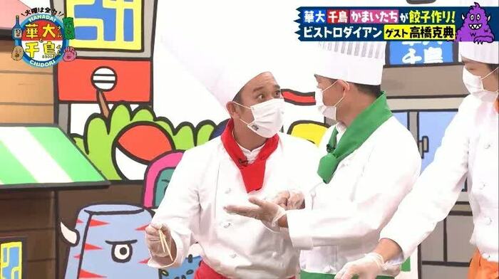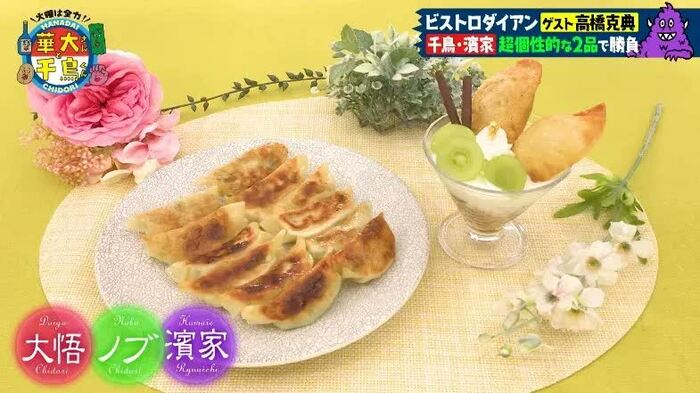 一方、千鳥&濱家チームは、料理が得意な濱家の案で“岩下の新生姜”を使った餃子を作る。さらに、大悟は岡山のマスカットとクリームチーズ、はちみつを使ってデザート風の餃子に挑戦。