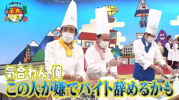 大吉と山内が包丁を使ってタマネギとニラのみじん切りをすると、華丸がさらにそれをフードプロセッサーに入れるよう指示。すると、これに山内の不満が爆発。ここから華丸と山内のバトルが勃発する。