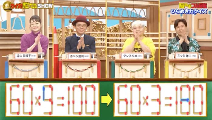 正解はまず、「9」から1本を動かし「3」に。その1本を右の式の「0」に足して「180」にします。そうすれば「60×3=180」となり、正しい式になりました。