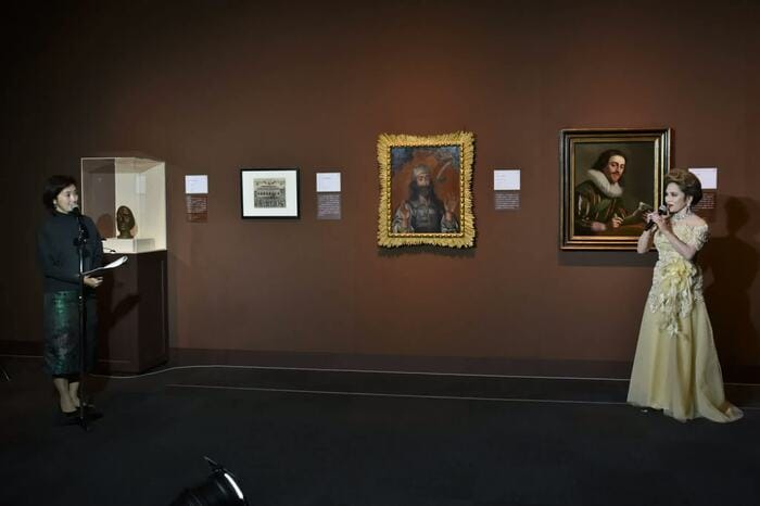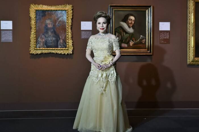 司会の佐々木恭子フジテレビアナウンサーから、展覧の印象を聞かれたデヴィ夫人は「特にエリザベス女王が描かれた作品は、繊細さと美しさ、威厳を感じました。女性としては、衣装や宝石などにも注目しました。あの特徴的な襟は“エリザベス”と呼ばれていて、ワンちゃんの首につけるあの襟の名前の元になったんですよね」とコメントした。