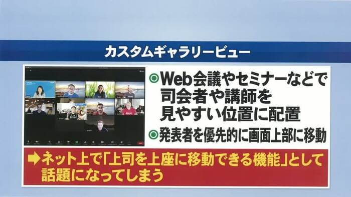 「オンライン交流のモヤモヤ」というテーマで議論になったのは、「オンライン会議で上司を上座に移動させる必要があるか?」という問題だ。オンライン会議サービスを提供しているZoomが、会議の参加者の位置を変えられる「カスタムギャラリービュー」を導入した際に、「上司を上座に移動できる」とSNSなどで話題になったのだという。