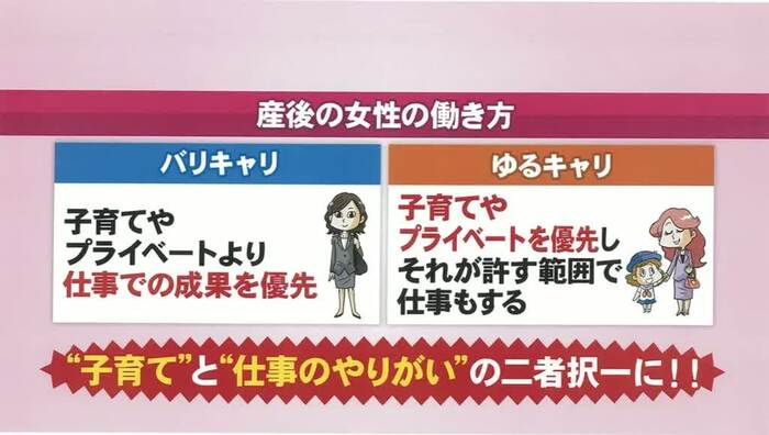 産後の女性が、育児より仕事を優先する「バリキャリ」と仕事より育児を優先する「ゆるキャリ」の二者択一になりがちな中、子育ても仕事も意欲的に取り組む「フルキャリ」という生き方が提唱されているそうだが、横澤は「仕事を自分で選べる役職の女性でなければ難しいのでは?」と問題提起。