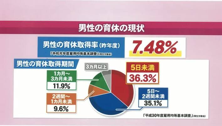 劇中では、育休を取得すると夫の職場での地位が危うくなる可能性があることなども描かれており、実際、日本の男性の育休取得率は7.48%しかないというデータも紹介された。