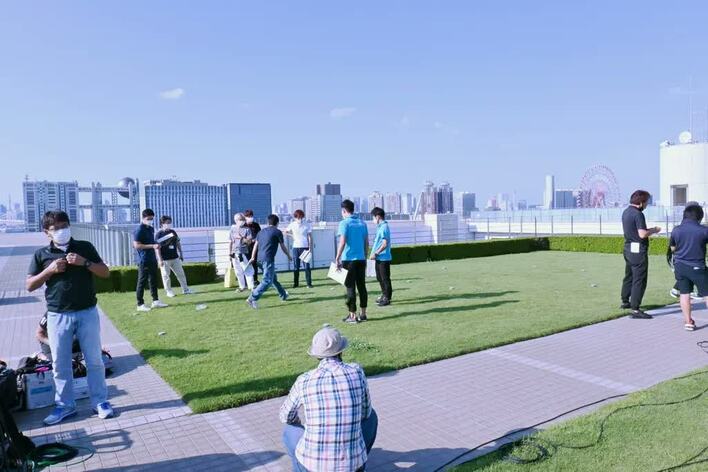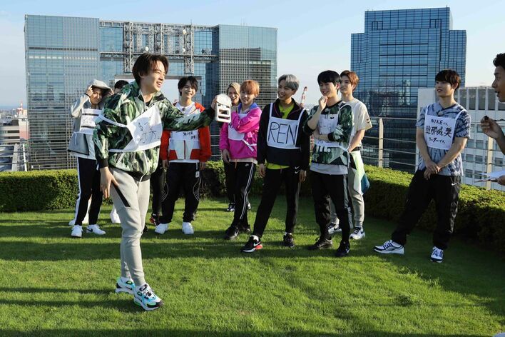 JO1の『体力No1』を決定する初回放送の収録は、フジテレビ湾岸スタジオの屋上で決行。屋上での撮影ということで、景色は最高!JO1も絶景に感動した様子で、「すげー!」とハイテンションで現場入り。この日は天気にも恵まれ、降り注ぐ日差しに、眩しそうに目を細めるメンバーも。