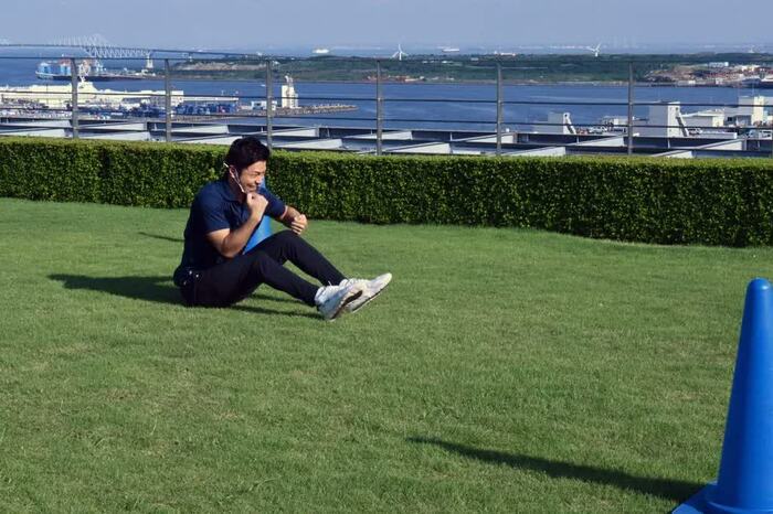 「長座の状態から、手をつかずに身体を揺らして前進して5m先のゴールを目指す」というルールを聞くと、「ジャンプでもいいんですか?」と、最速の方法を編み出すために知恵をしぼるメンバー。
