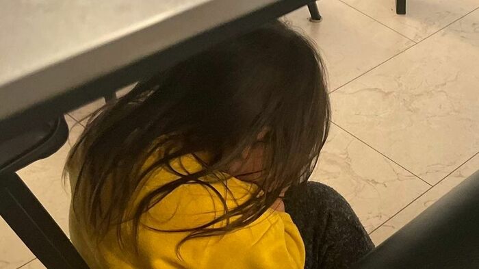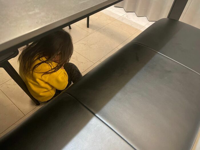 テーブルの下に入り顔を伏せていたりと、いろちゃん自身の視界は遮られているものの、周りからは“丸見え”の状態!
