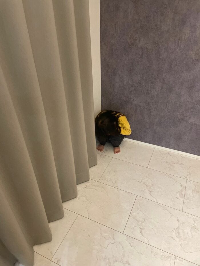 今回話題になったのは、投稿者であるいろちゃんのお母さんが「3歳児とのかくれんぼ、楽勝すぎて愛おしい。」というコメントとともに公開したいろちゃんとのかくれんぼの様子。