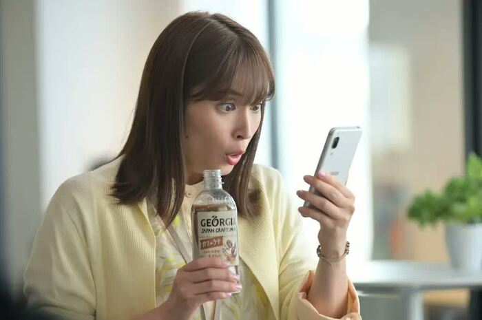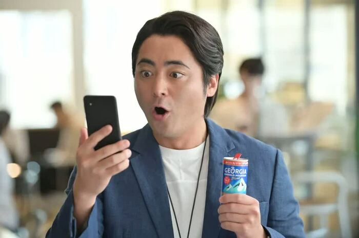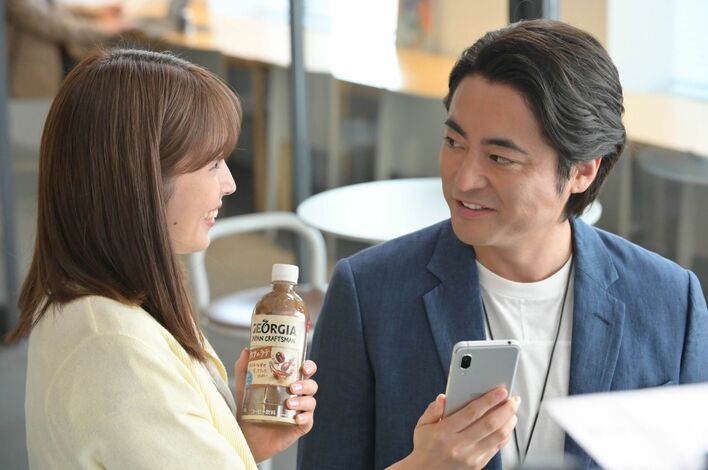 CMでは、オフィスの休憩スペースにある、自販機の前で同僚とひと休みしていた広瀬が、“当たり付き”ジョージアで当たって大喜び。あまりのうれしさに、広瀬はたまたま近くを通った先輩、山田にも、スマホの当たり画面を見せながら笑顔でアピールする。それを見た山田は、クールな表情を崩すことなく、「子どもじゃねぇんだし」と答えて通り過ぎようとする。しかし広瀬に、山田が持っていた“当たり付き”ジョージアを指差され、「先輩のも抽選できますよ」と伝えられると、思わず「えっ?」と立ち止まる…といったストーリーが描かれる。
