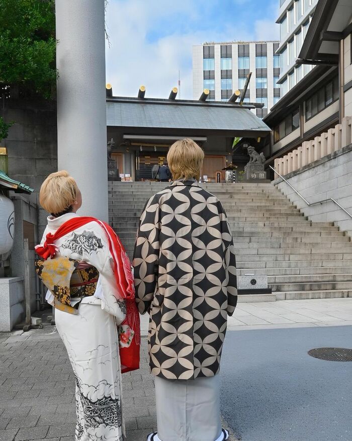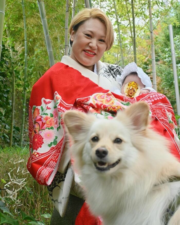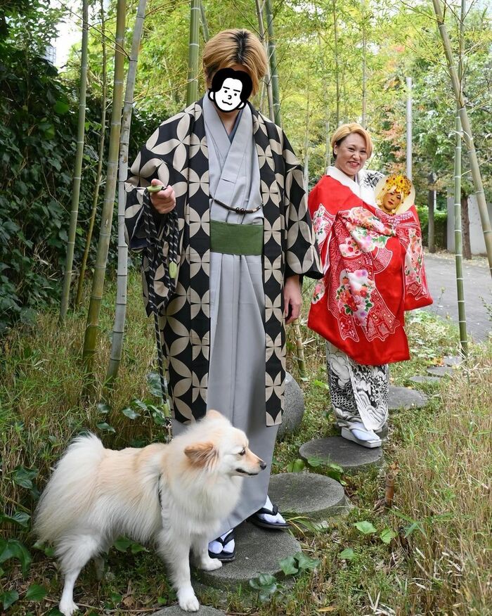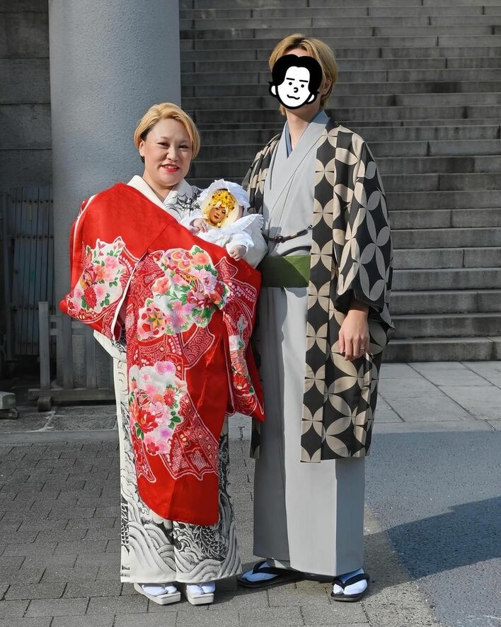 家族そろってお宮参りに出かけたそうで、バービーさんの隣には顔はスタンプで隠されていますが、同じく着物姿で立つ夫の姿が。