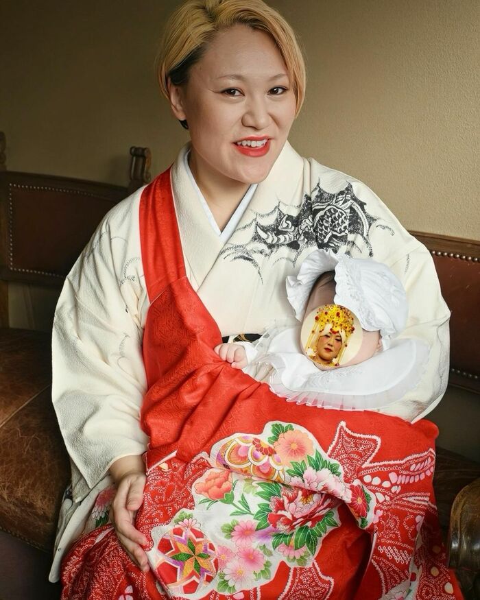 着物姿で8月に生まれたばかりの第1子を抱きながらカメラに笑顔を向けるバービーさん。