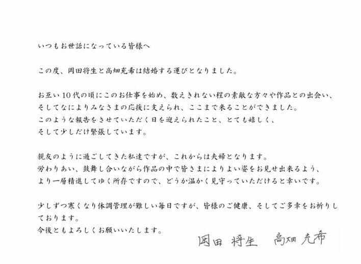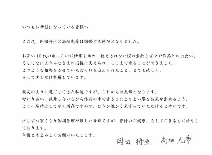 続けて「親友のように過ごしてきた私達ですが、これからは夫婦となります。労わりあい、鼓舞し合いながら作品の中で皆さまによりよい姿をお見せ出来るよう、より一層精進してゆく所存ですので、どうか温かく見守っていただけると幸いです。今後ともよろしくお願いいたします」と結び、最後に直筆で「岡田将生 高畑充希」と署名を添えました。