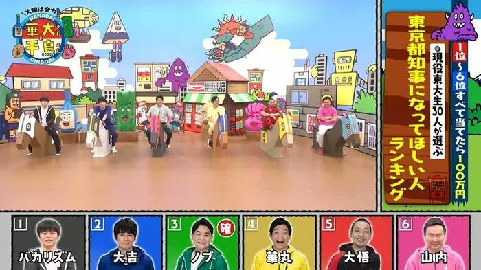 バカリズムと博多華丸・大吉、千鳥(大悟・ノブ)、かまいたち・山内の6人が協力して、自分たちに関するランキングを1位から6位まで予想。順位のぴったり的中で賞金100万円獲得という企画。
