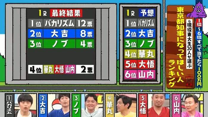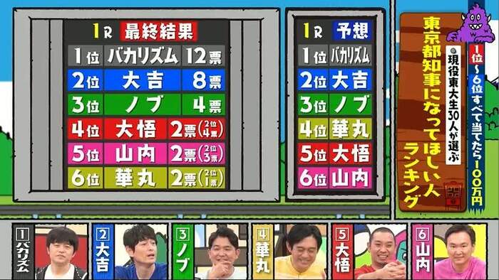 そんな中、山内が「みんな、スキャンダルが出る都知事には、うんざりしてると思う」という理由から大悟を最下位に予想した。