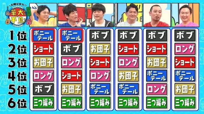 と、ボケ合戦の様相を呈してきたところで、6人はそれぞれの髪型のかつらをかぶって予想順位の席に座っていった。