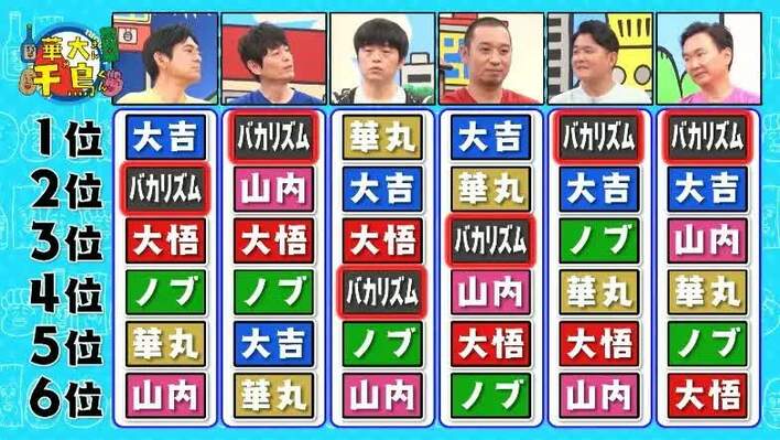 結局、おとなしく見守っていたバカリズムの「山内さん最下位は、揺るがせない!」という発言により、山内はしぶしぶ6位予想の席に座ることに。