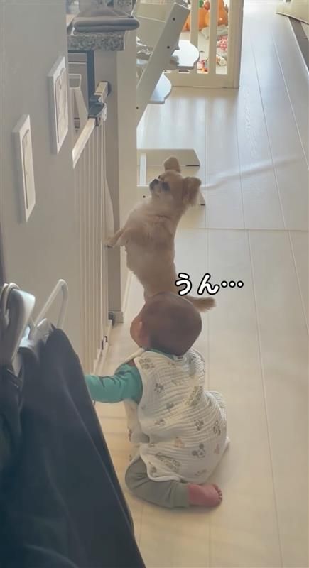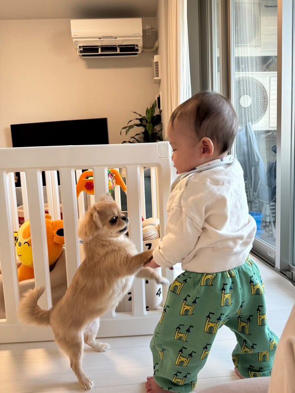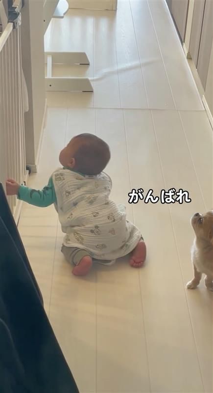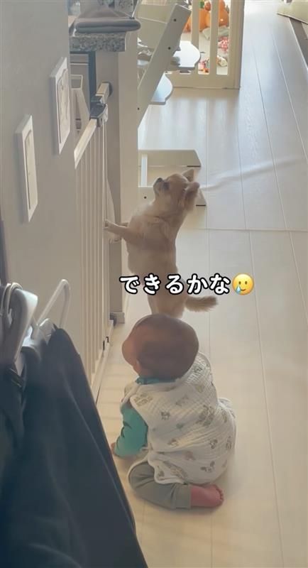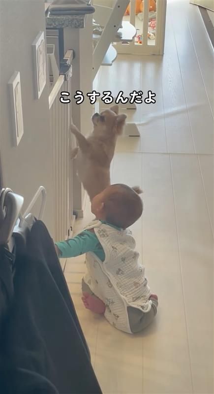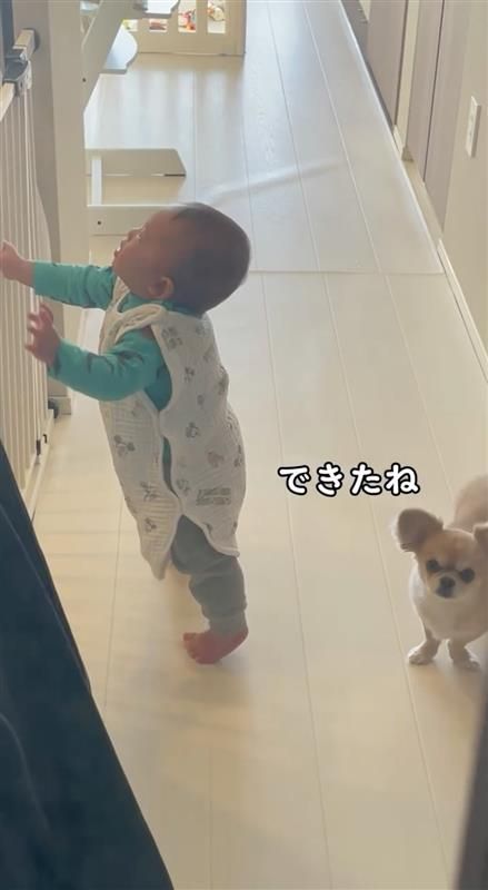 ハナちゃんは、柵を握ることができないので、前足でカキカキしながら体を支え続けたり、片足でそのままキープしたりと、弟くんに“立っち”のお手本を見せているようです。