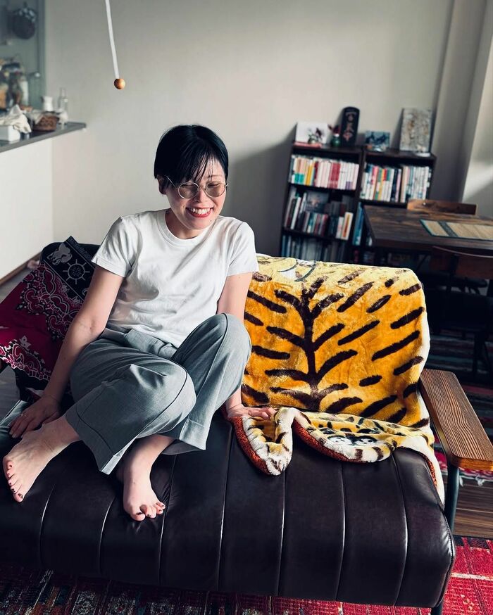 さらに、革張りのソファーに座り、白いTシャツを着てメガネをかけた誠子さんの姿も。
