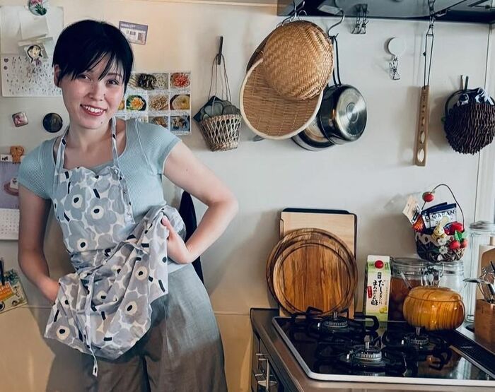 キッチンで、水色の花柄が描かれたエプロンを身に付けた誠子さんの姿が。カメラ目線で、エプロンを着用する姿は、これから料理を始めるかのようです。