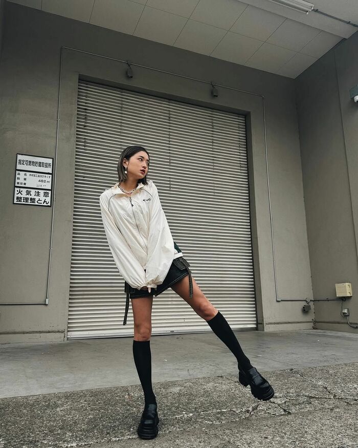 ホワイトカラーがメインのナイロンパーカーを羽織り、ミニ丈のデニムスカートををはいた、美脚際立つショットを投稿したみちょぱさん。黒のハイソックスにローファーを合わせており、寒い日にもかかわらず、おしゃれに着こなしています!