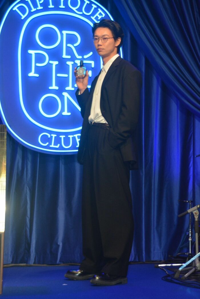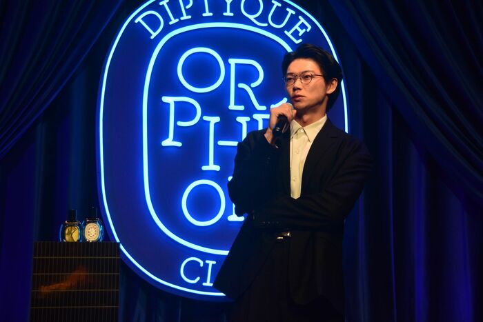 リラックスしたスーツに眼鏡姿でイベントに登場した笠松さんは、「Orphéon」の香りを「大人っぽいけれど甘くて、落ち着いている」と表現。